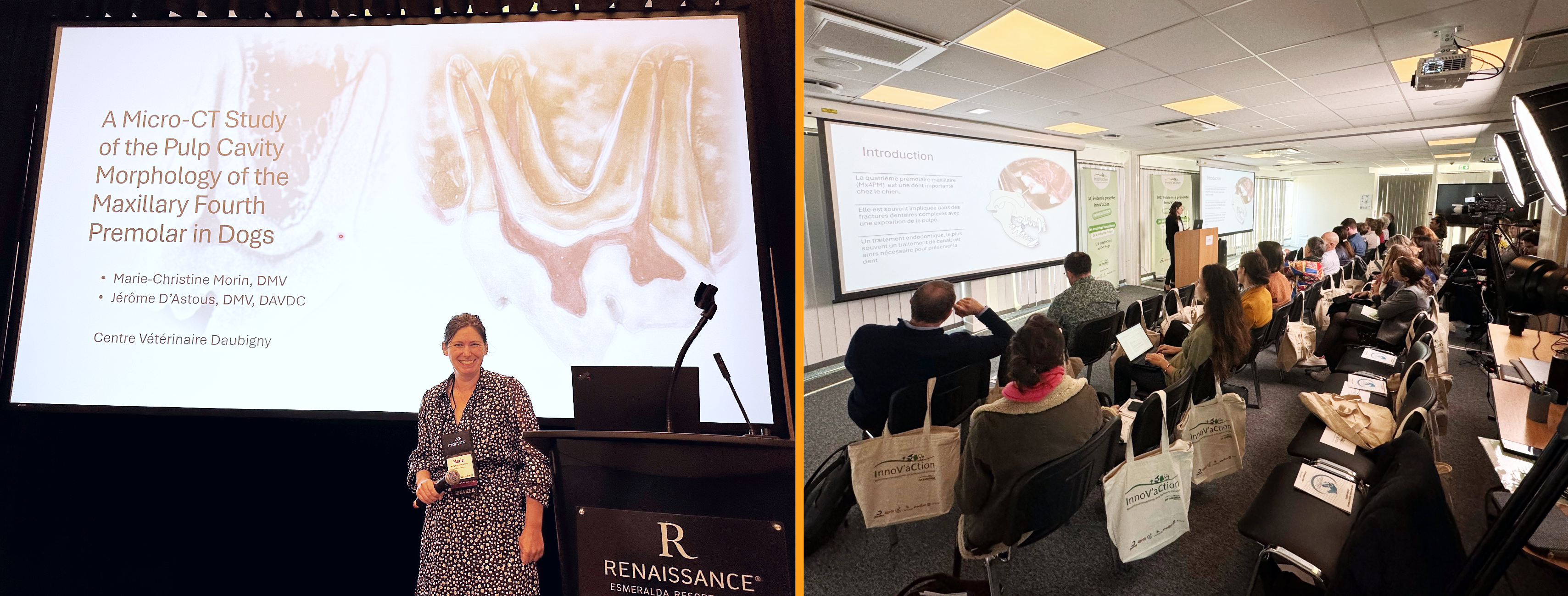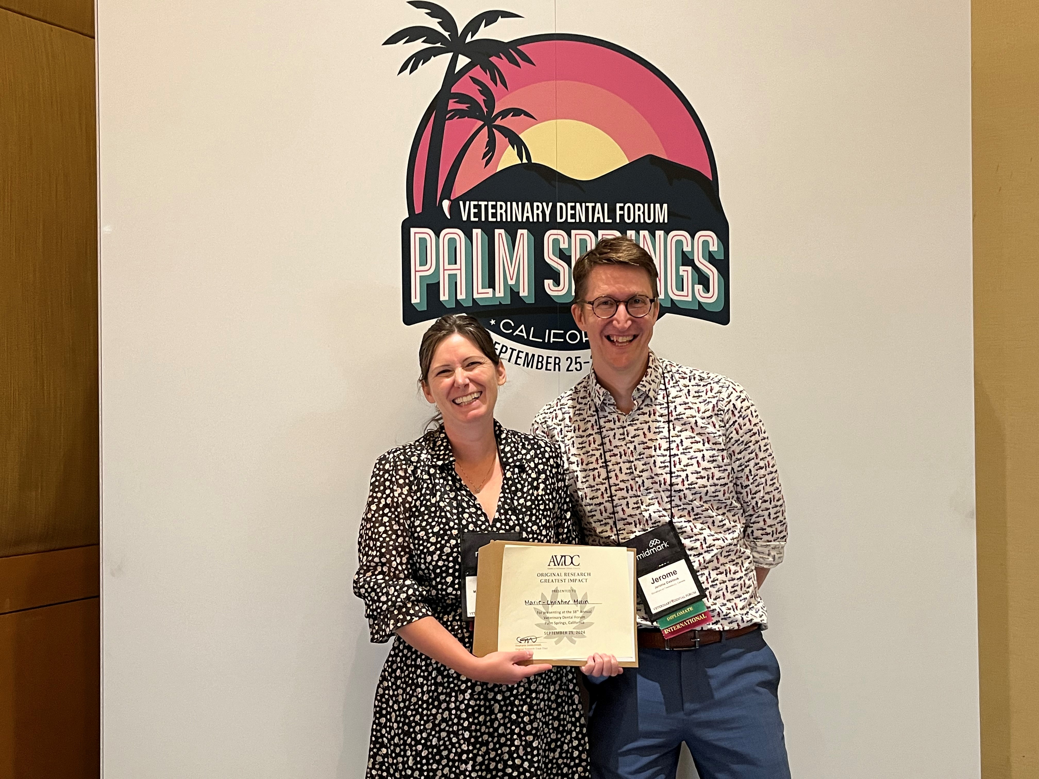 Les résultats ont été présentés lors du Veterinary Dental Forum à Palm Springs, en Californie, l’automne dernier. Dre Morin a remporté le prix pour l’étude ayant le plus grand impact clinique. Nous sommes fier(-ère)s que leur projet ait une répercussion tangible dans la pratique des dentistes vétérinaires. Dre Morin a également été invitée à présenter son projet à Paris, lors de l’événement InnoV’aCtion, organisé par IVC Evidensia.