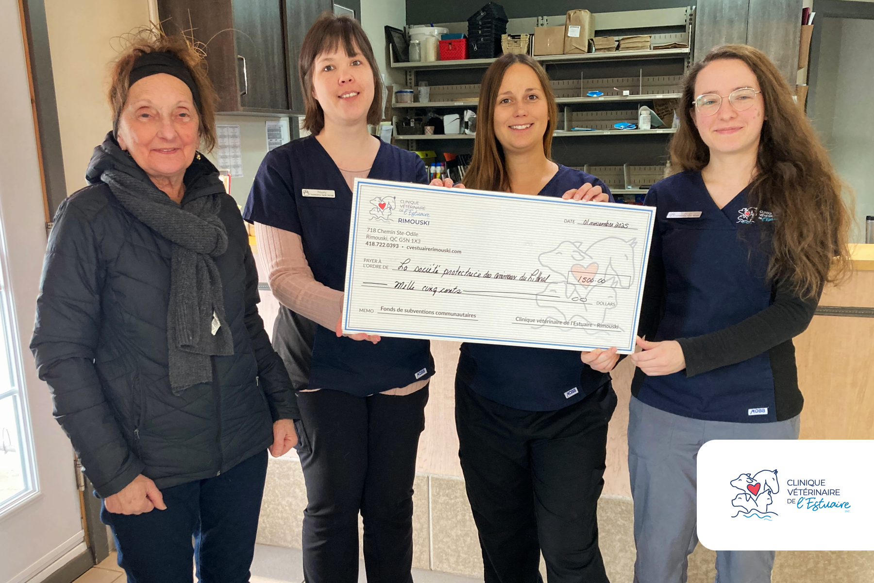 Au dernier trimestre de l’année fiscale 2025, la Clinique vétérinaire de l'Estuaire – Rimouski a choisi de faire don de sa subvention de 1 500 $ à la Société protectrice des animaux du Littoral (SPAL), un refuge éthique pour animaux domestiques dans la région de Rimouski. Chaque année, la SPAL recueille approximativement 250 animaux.